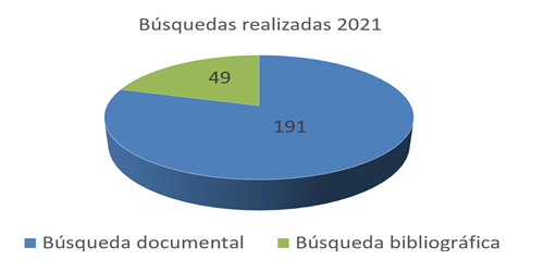 Además, favorecemos y apoyamos el desarrollo de nuevas ideas, la elaboración de artículos, etc. a través de nuestro servicio de búsquedas, el cual lleva más de 200 en lo que va de año y donde están predominando las búsquedas documentales (artículos, documentos y/o datos puntuales y concretos) sobre las bibliográficas (artículos y documentos científicos sobre un tema en forma de bibliografía).