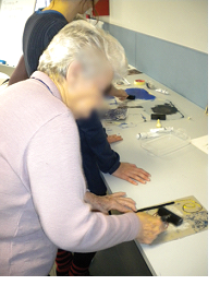 La experiencia se llevó a cabo en el Centro de Referencia Estatal de atención a personas con Alzheimer y otras demencias del Imserso en Salamanca. El método implementado consiste en previamente realizar una revisión bibliográfica para analizar los requerimientos de este perfil de participantes y cuáles eran sus intereses y conocimientos de arte. Diseño e implementación de actividades mediante la técnica del grabado no tóxico como herramientas para entender conceptos analógicos y digitales de creación contemporánea, de tal manera que los participantes desarrollasen su proyecto artístico personal (Figura 1).